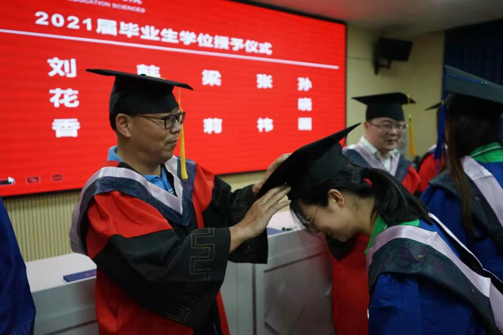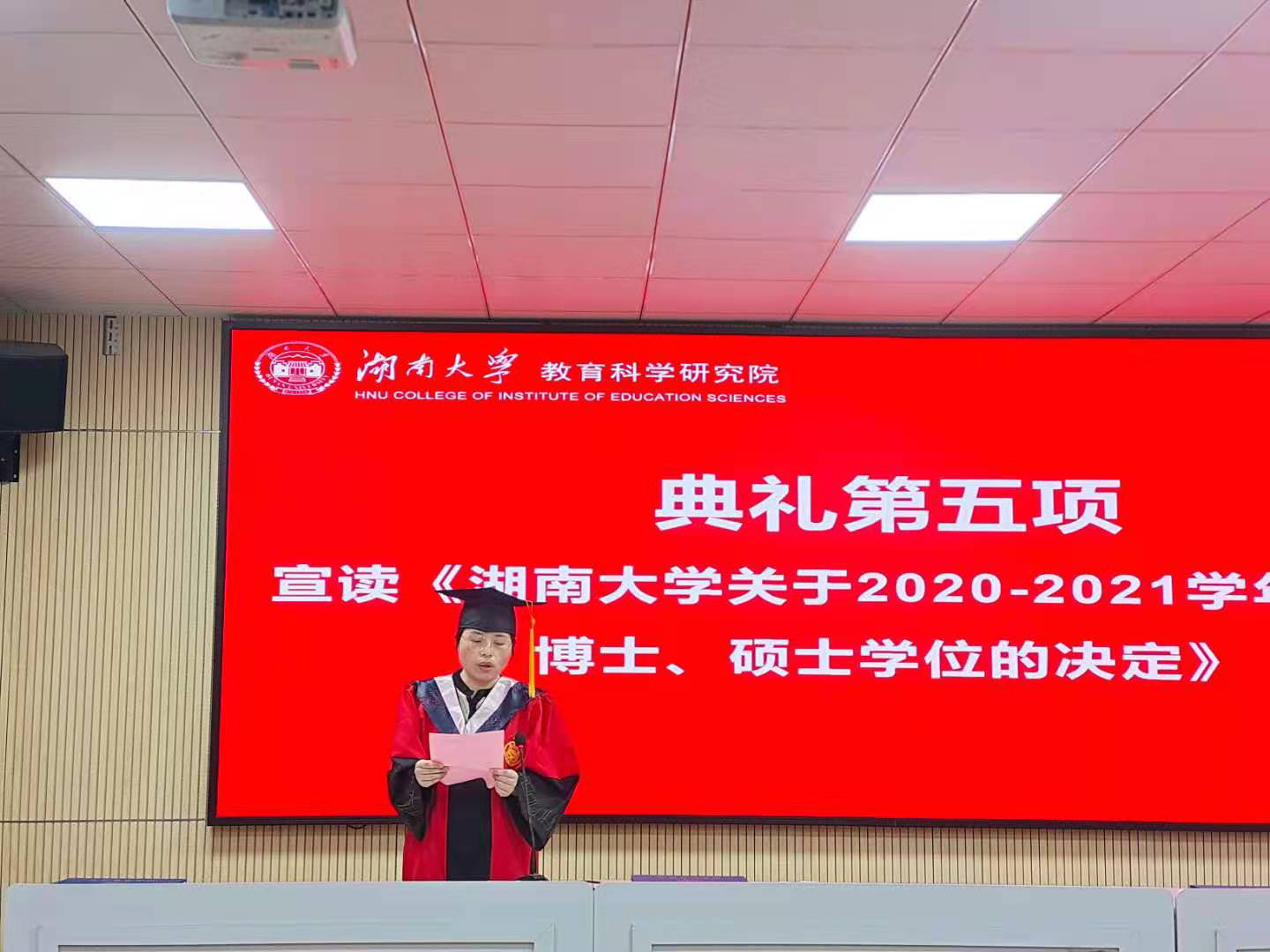 徐丹副院长宣读《太阳成集团关于2020-2021学年度授予博士、硕士学位的决定》,授予太阳成tyc33455cc43名毕业生硕士学位。其中,授予童雨溪等14名毕业生教育学硕士学位,授予韩烨丹等14名毕业生管理学硕士学位,授予粟敏等15名毕业生教育硕士专业学位。