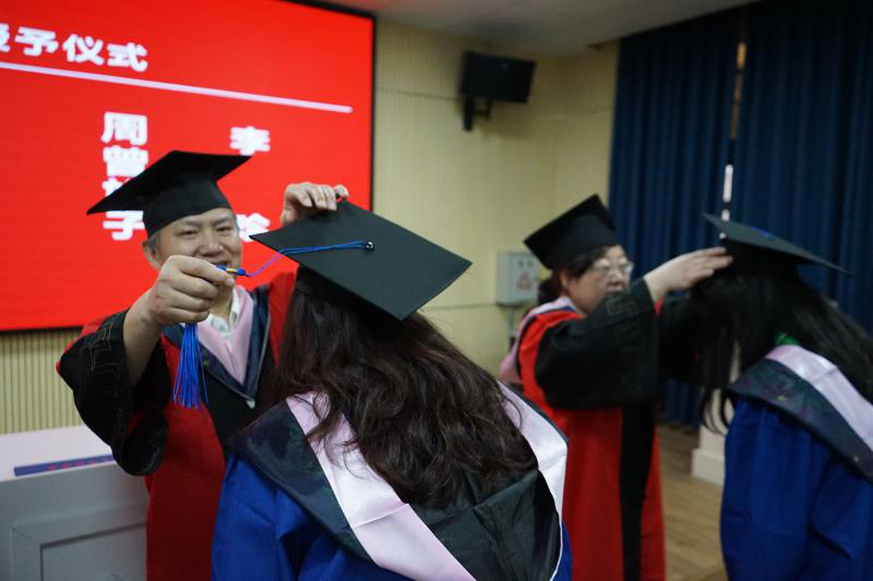 宣读完毕,毕业生们依次上台,由谢赤教授、余小波教授、姚利民教授、胡弼成教授、唐松林教授和蒋家琼教授为毕业生们正冠拨穗、颁发学位证书、赠院徽并合影留念。