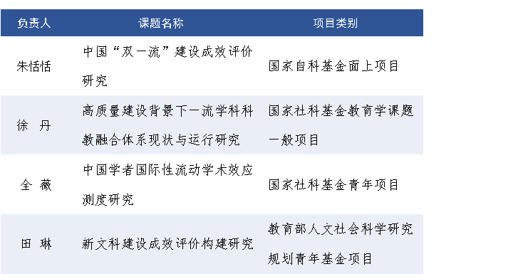 2022年度国家社科基金项目评审结果9月12日揭晓,太阳成tyc33455cc助理教授全薇主持的“中国学者国际性流动学术效应测度研究”获青年项目立项。在9月8日公布的国家自然科学基金项目评审结果中,朱恬恬副教授主持的“中国‘双一流'建设成效评价研究”获面上项目立项。此外,徐丹副教授主持的“高质量建设背景下一流学科科教融合体系现状与运行研究”获国家社科基金教育学课题立项,田琳助理教授主持的“新文科建设成效评价构建研究”获教育部人文社会科学研究规划青年基金项目立项。