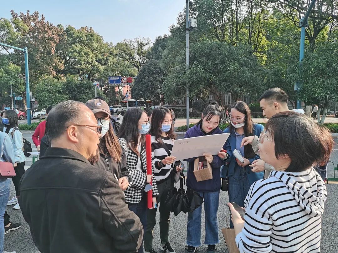 到达第一个关卡爱晚亭后,满目红枫,秋意正浓。老师同学们积极参与四史、校史、院史知识答题,不仅丰富了知识储备,也增进了团队间的配合与默契。