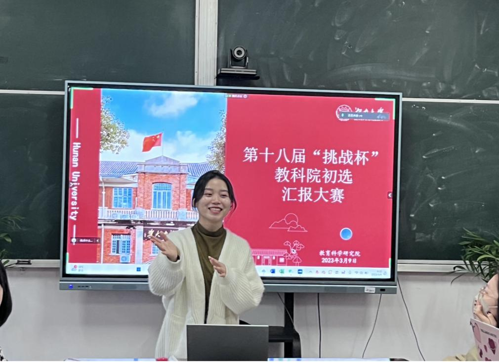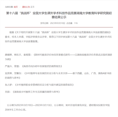 为进一步引导和培育我院学生追求真知、锐意创新的科学精神,全面提高自身修养和科研素质,充分展示学生风采,营造良好学术氛围,激发科研创新活力,3月8日上午,我院于银杏楼201会议室举行2023年第十八届“挑战杯”课外学术科技作品竞赛院内公开选拔赛,本次院内选拔赛分为初审与复审两个阶段,由院团总支宣传委员张婷主持,邀请学院团总支书记柏静老师、院长助理袁建林副教授担任评委,5支参赛学生队伍共9人参加。