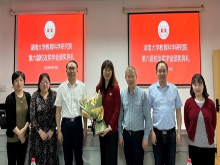 罗院长对校友奖学金的设立与发展历程进行了回顾,对获奖同学表示了衷心的祝贺,对关心支持教科院发展的校友表达了真挚的感激。他指出,青年学子肩负着时代赋予的使命,要自觉把个人发展融入到党和人民的事业中去,谨记湖大“实事求是 敢为人先”的校训精神,发挥“立传道济民之志,扬湖大教科之光”的教科精神,既要做坚定信念、有理想、有抱负的时代青年,还要做勤奋学习、有知识、有才干的时代青年,更要做修身明德、有品德、有魅力的时代青年。