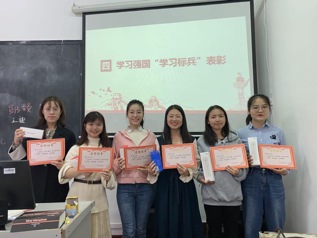 在理论学习环节,支部成员一起学习习近平总书记来湖大考察时的重要讲话精神,并纷纷发表自己的学习体会。王艺霖提到,我们应该放眼世界,胸怀天下,以世界的标准要求自己进步,不辜负习总书记的期望。徐淼针对习近平总书记的发言感触颇多,她说道,作为新时代的新青年,应该立足于实践,系好人生的第一颗纽扣。最后,支部对上学期“学习强国”学习标兵进行表彰。
