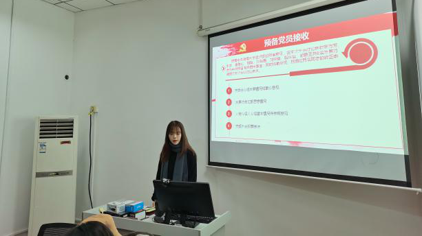 支部书记廖敏向大家汇报党员到场情况,随后进行接收预备党员会议的四项基本流程:第一,发展对象汇报思想情况;第二,入党介绍人介绍发展对象有关情况并表明意见;第三,支部委员会报告预审情况;第四,支部大会投票表决,荣方芳、张祎、唐雅伦、梅晗、孙晓画、路俊怡、舒霞玉、刘安琪等8名同学被接收为中共预备党员,戴安妮、杨菲两位中共预备党员按期转正。