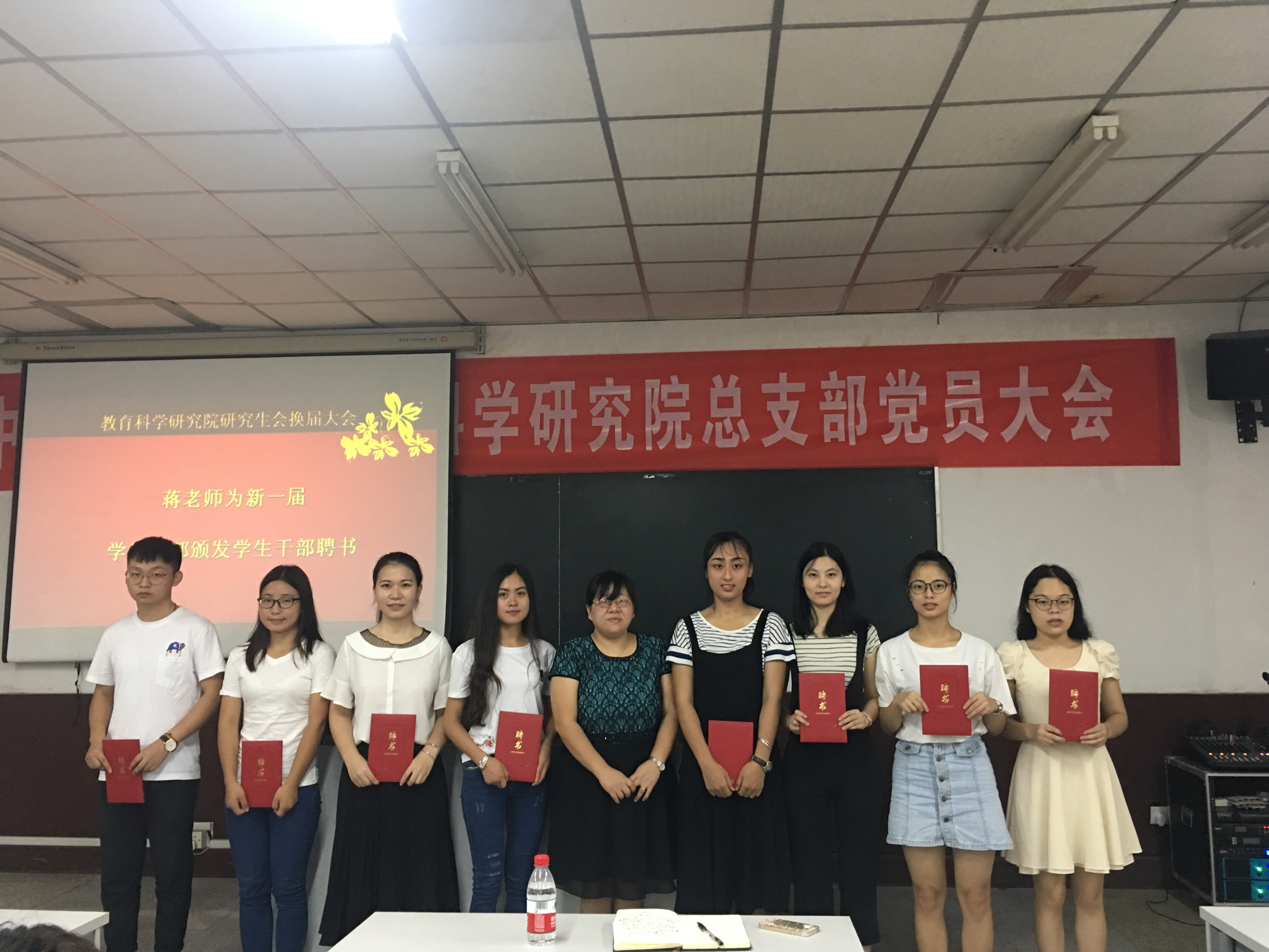 首先,主席戴文静代表研会对15届新成员表达了热烈的欢迎,对过去的工作进行了总结,对未来研会的发展提出了新的期望和要求。为加深我们对研会的了解,更是向我们展示了14届研会的各种丰富多彩的课外活动。随后,学院研会主席宣布了第15届研究会学生干部名单及职务,并由副院长蒋家琼教授为新一届学生干部颁发学生干部聘书。而后,办公室主任杜宛宛、学习部部长马秋阳、宣传部部长梅诗琪、文体部部长曾媚纷纷上台介绍了各部门的工作范围和今后具体的工作安排,15届新成员也表示将积极配合工作,共同做好研会的相关工作。