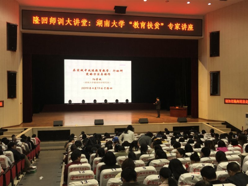 4月13日,我院“教育扶贫”专家讲座在隆回县影剧院举行,阳荣威副院长作题为《在实践中改进教育教学:行动研究的方法与操作》的讲座,为隆回当地800余名中小学教师进行职业培训。