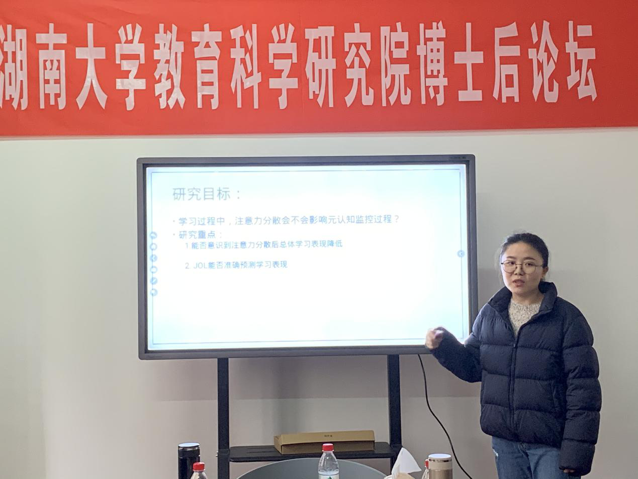 彭瑶萍博士后则做了题为“自主学习过程中注意力分散对元认知监控的影响”的报告。针对目前学习过程中分散的注意力对学习和记忆表现的消极影响,她通过对注意力分散过程中的元认知监控的有效性进行实验研究,得出一系列结论,该研究可以帮助学习者在注意力分散时提高学习效率和学习表现,更好地适应信息时代。