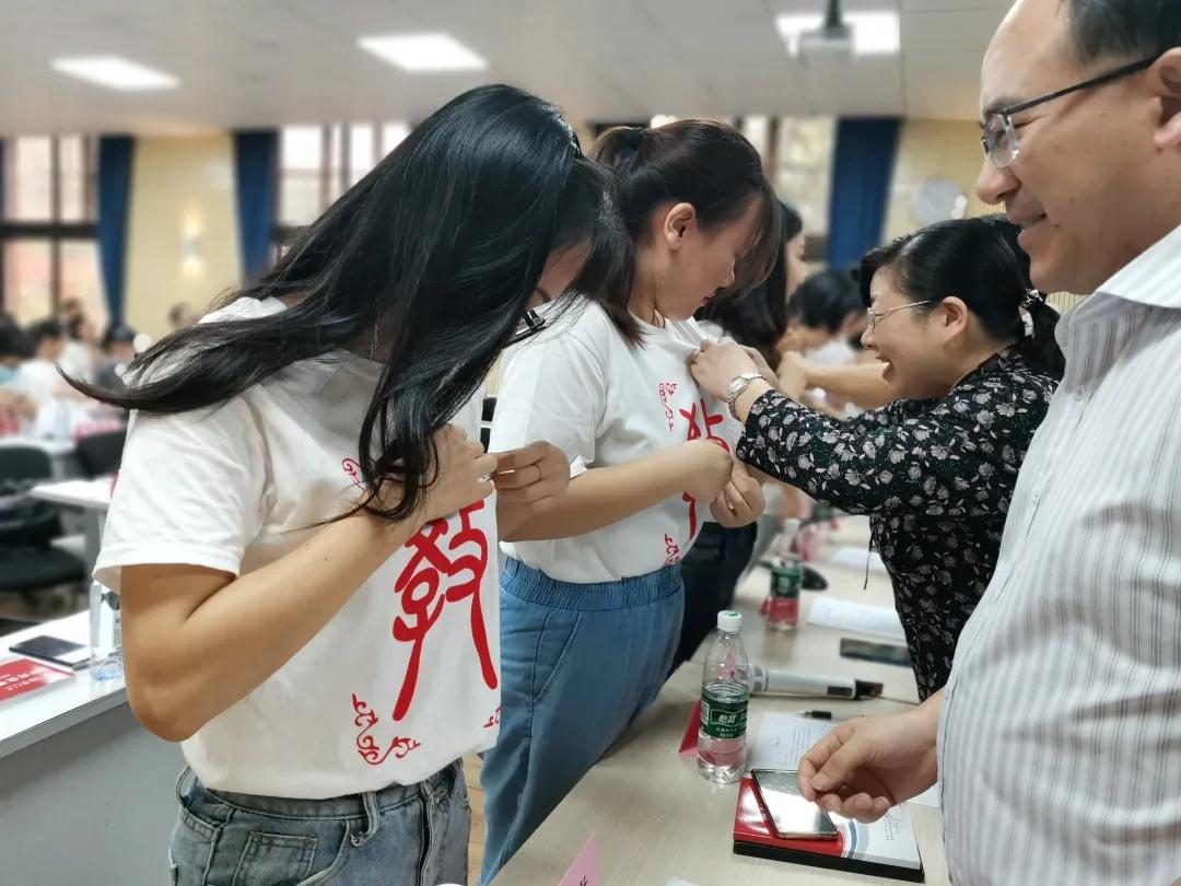 典礼最后,导师们为新生佩戴校徽。入学教育环节,教学秘书曾兴无介绍了学院研究生培养方案和选课等重要事项。辅导员柏静带领同学们认真研读了研究生手册,重点强调了学籍管理规定、论文署名和学术道德规范等方面的要求。