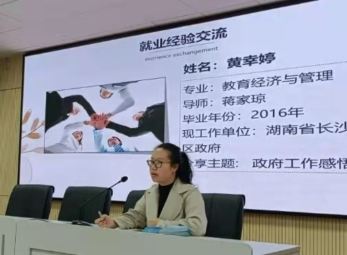 2016年毕业的黄幸婷学姐分享了她在政府工作的感悟。她从如何进入体制内、政府部门工作情况、发展空间等方面展开详细介绍,并积极向大家宣传长沙市人才引进政策。“岳麓山下好读书、岳麓山下读好书”,她希望同学们读书期间认真完成学业,积极完善自我,同时建立专业自信,以昂扬的姿态面对未来挑战。