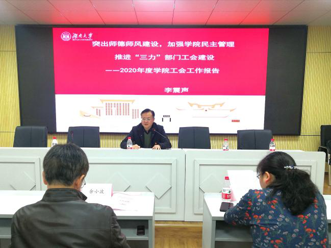 院长余小波代表学院作行政工作报告,回顾了2020年工作,提出了2021年学院的工作目标和重点任务。副院长徐丹作2020年度学院财务工作报告,院工会副主席李震声作2020年学院工会工作报告,院工会委员袁建林作提案工作报告,党总支书记、工会主席阳征作院工会十四五规划方案(草案)说明。大会以举手表决的方式,通过了学院行政工作报告、财务工作报告、工会工作报告、提案工作报告和院工会十四五规划方案(草案)。