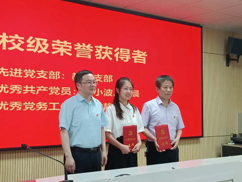 谢赤副校长为校级荣誉获得者颁发荣誉证书。教工支部获评“太阳成集团先进党支部”,教师余小波、研究生丁晨获评“太阳成集团优秀共产党员”,教师柏静获评“太阳成集团优秀党务工作者”。