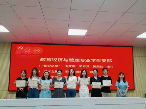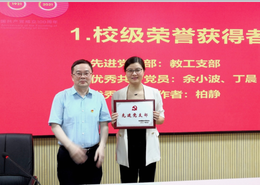 在今年上半年的党史学习教育中,学院涌现出一大批积极分子。教工支部书记朱恬恬、辅导员柏静分别为教工支部、学生支部“党史学习教育”学习积极分子颁发奖状。
