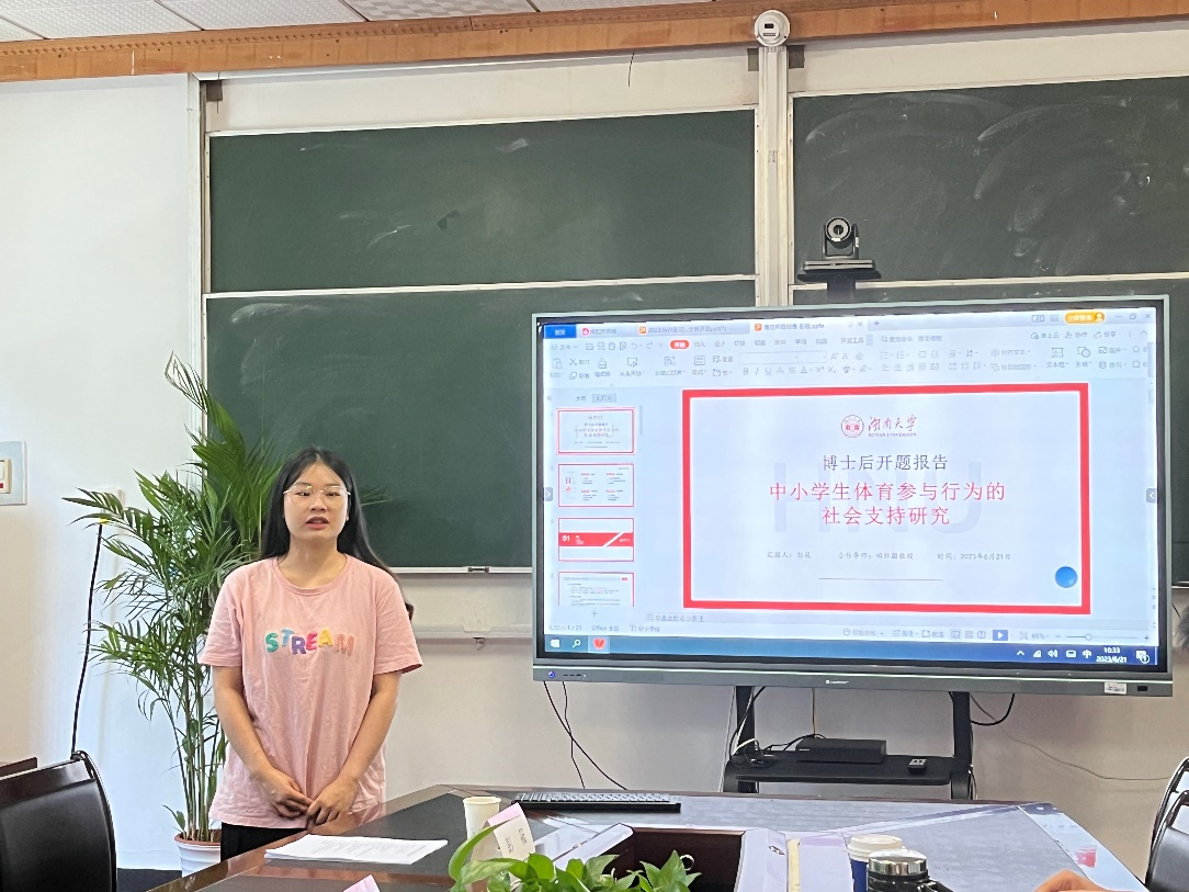 彭筱博士后以《我国中小学生体育参与的社会支持研究》为题,围绕选题依据、研究问题,文献述评、研究设计、创新之处与预期成果等几个方面,对进站研修计划进行了系统汇报。汇报结束后,专家组成员就开题报告展开了热烈讨论,提出了问题和指导意见,彭筱博士后进行了回应,并明确了改进方向。