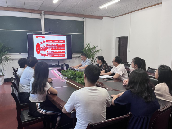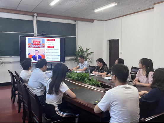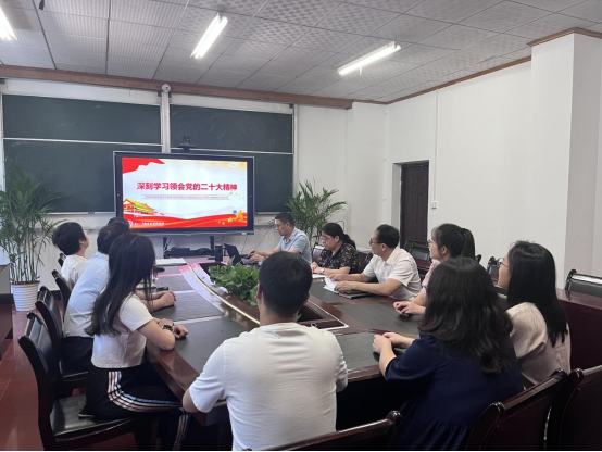 6月27日下午,太阳成tyc33455cc党总支在银杏楼201会议室开展学习贯彻习近平新时代中国特色社会主义思想主题教育第四期读书班活动,教工党支部书记袁建林以“深刻学习领会党的二十大精神”为主题进行讲解,师生党员共同参加。