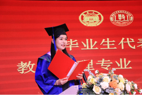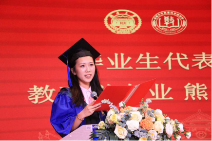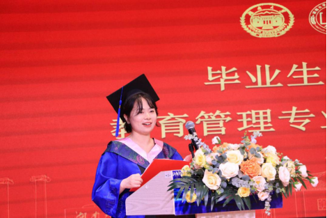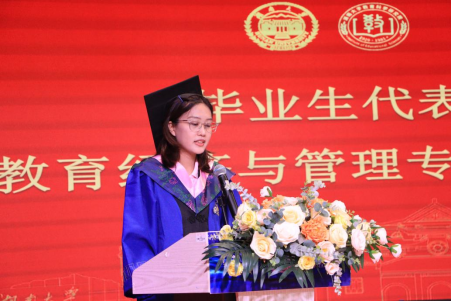 2024届毕业生代表熊乐天、陈思、贺馨仪、邱霈云依次发言。她们回顾了在湖大教科院的求学时光和收获成长,感恩母校和学院老师们的悉心栽培,感谢同窗好友们的陪伴支持,并真诚地祝愿母校和学院桃李天下,蓬勃发展。最后,她们都表示会始终铭记“实事求是,敢为人先”的校训,秉持“经世致用、兼容并蓄”的品格,立志用所学与所能传递湖大精神,肩担教科使命,在为理想事业的不懈奋斗中绽放青春。