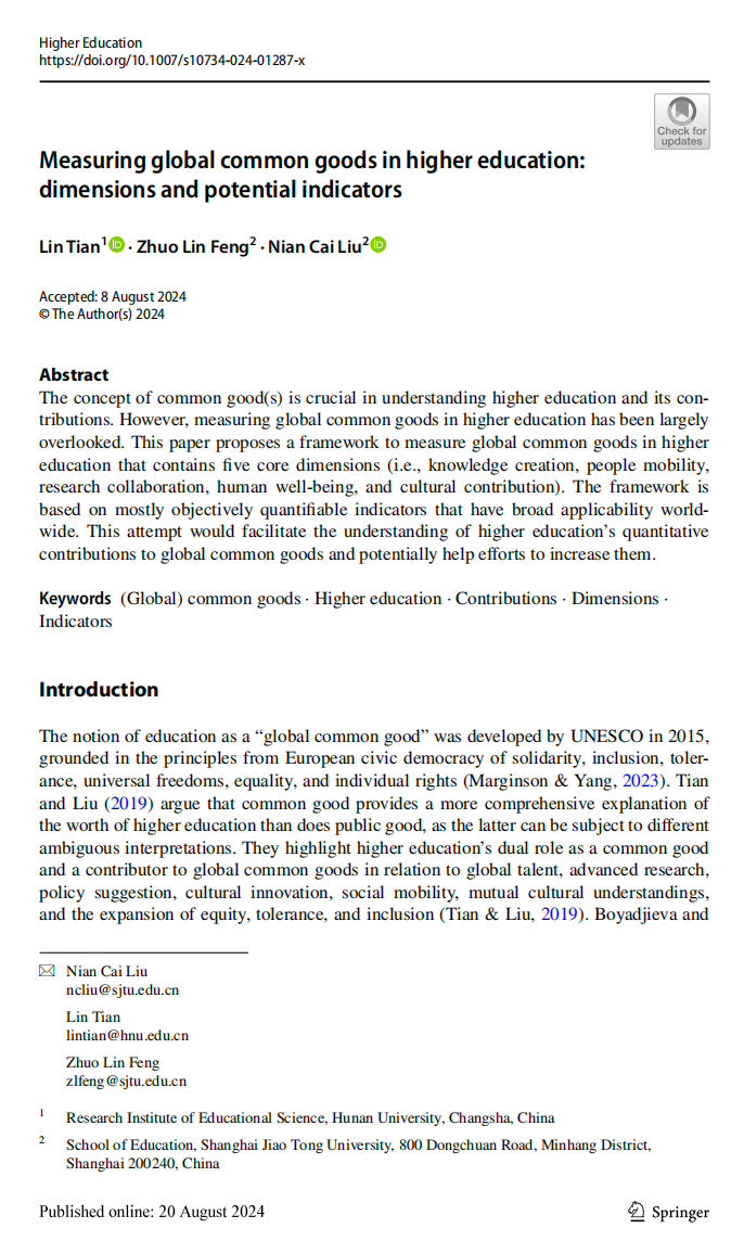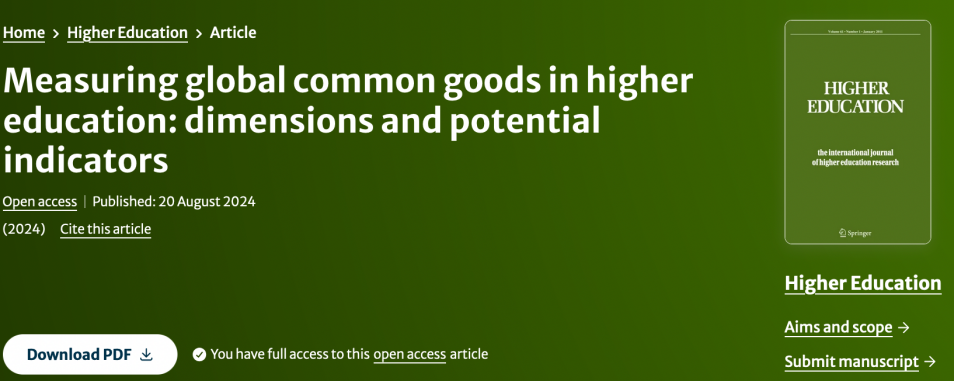 近日,我院田琳副教授在高等教育研究领域取得进展。研究成果以“Measuring global common goods in higher education: dimensions and potential indicators”为题在国际高等教育权威期刊《Higher Education》上发表。