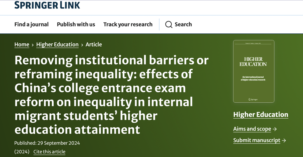 近日,我院宋琼将助理教授在高等教育研究领域取得进展。研究成果以“Removing institutional barriers or reframing inequality: effects of China’s college entrance exam reform on inequality in internal migrant students’ higher education attainment”为题在高等教育学领域国际权威期刊《Higher Education》上发表。