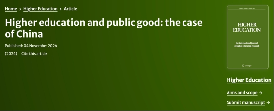 近日,我院田琳副教授在高等教育研究领域取得进展。研究成果以“Higher education and public good: the case of China”为题在国际高等教育权威期刊《Higher Education》上发表。