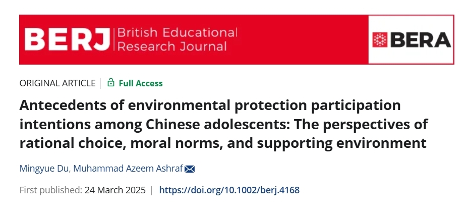 近日,我院ASHRAF MUHAMMAD AZEEM副教授与2024级硕士生杜明悦在教育学研究领域国际知名期刊《British Educational Research Journal》发表题为《Antecedents of environmental protection participation intentions among Chinese adolescents: The perspectives of rational choice, moral norms, and supporting environment》的研究论文。该研究构建了一个全面的青少年环境行为意图模型,为理解青少年环保行为意图的形成机制提供了新的视角,并为未来环境教育干预与政策制定提供了宝贵的理论支持。