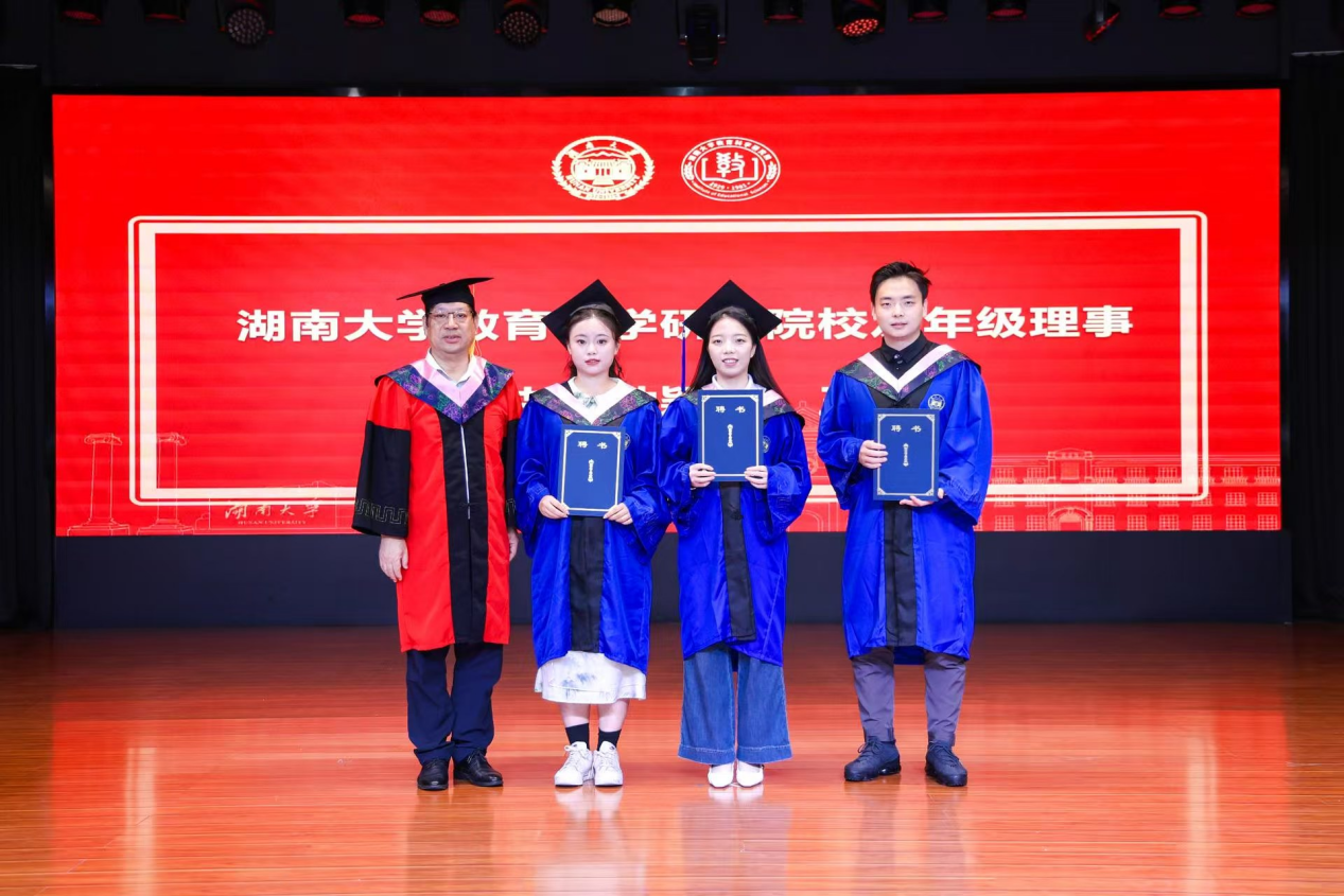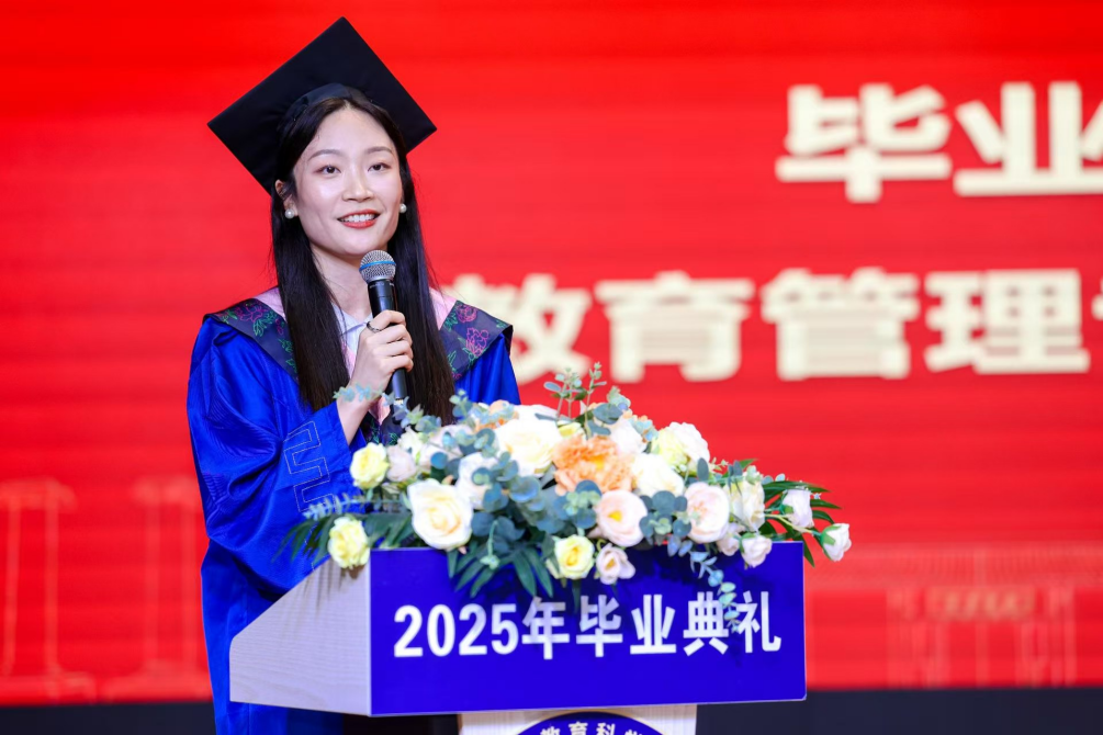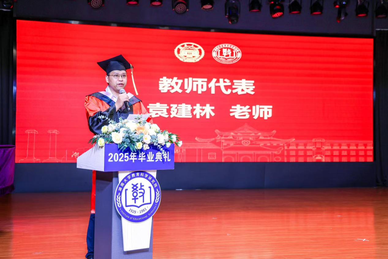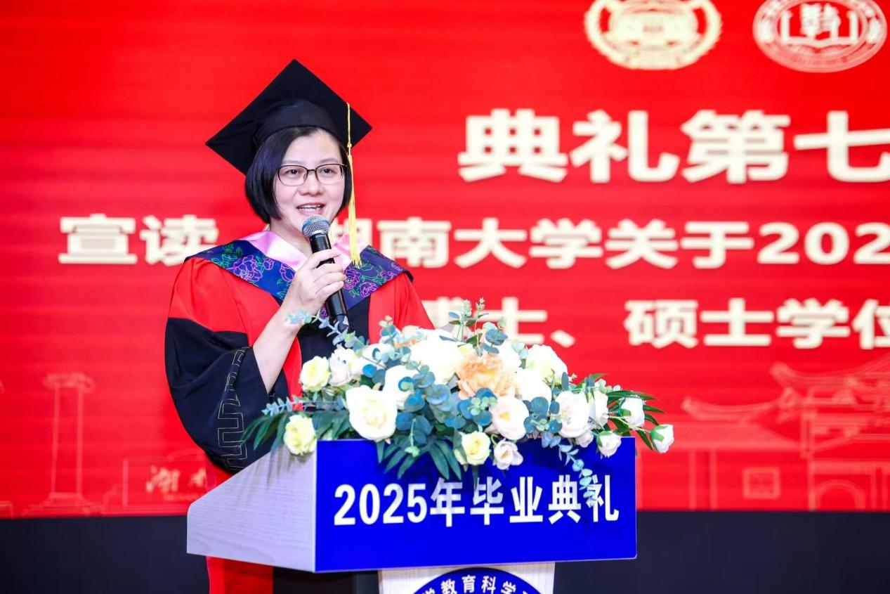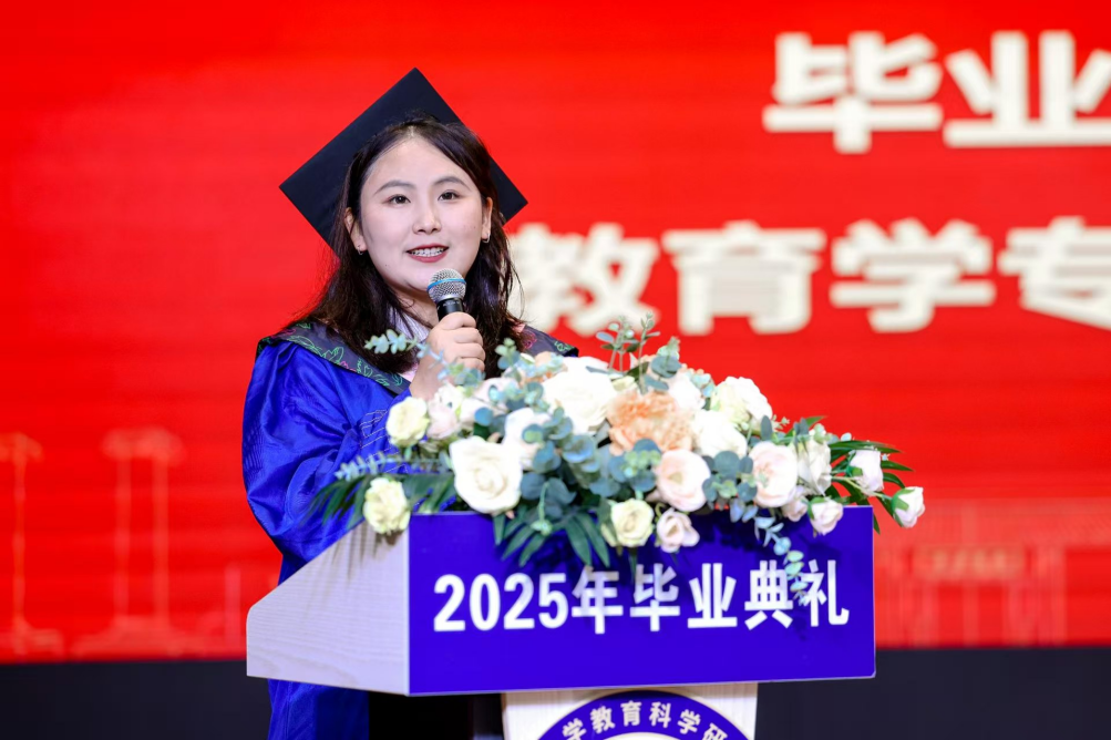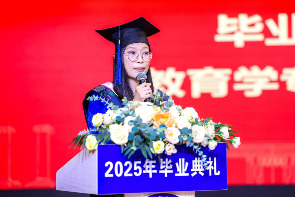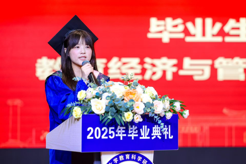 2025届毕业生代表陈金娥、陈丽文、李冰、肖思沁依次发言。她们深情回顾了在湖大教科院的求学岁月,由衷感恩师长的倾囊相授与学院的温暖关怀,亦难忘同窗珍贵情谊,衷心祝愿母校和学院葳蕤长青、桃李天下。同时郑重表示,无论未来投身何方,“湖大人”与“教科人”是永恒的烙印,也将始终铭记“实事求是,敢为人先”的校训,秉持“博学、睿思、勤勉、致知”的品格,在未来的人生道路上继续传递湖大精神,播撒理想、用奋斗绽放青春。