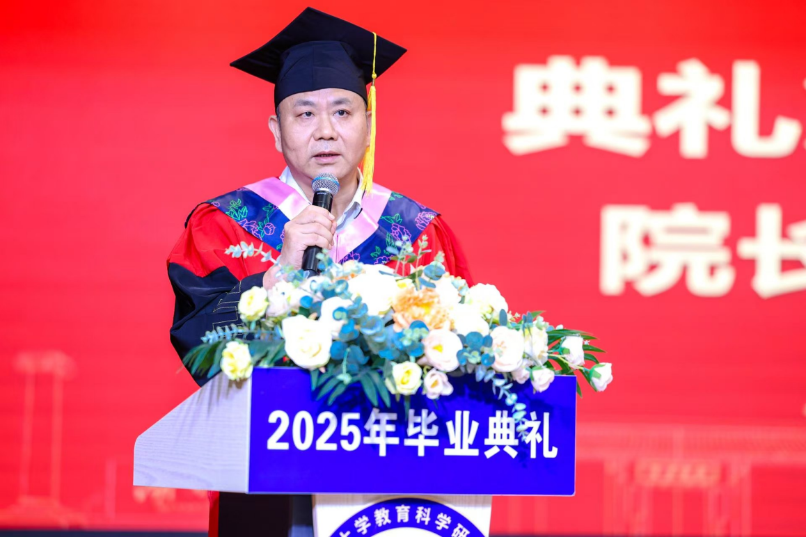罗仲尤以“幸福人生”为核心要旨勉励毕业生。他叮嘱道,幸福是人生的至上目标,实现幸福人生需要深刻领悟并践行四点:一是懂得感恩惜福,感恩能减少精神内耗、带来积极情绪,惜福则助人知足、知不足,从而提升幸福感;二是校准价值罗盘,物质幸福短暂,唯有将个人价值融入人类福祉的追求,方能获得精神层面持久深远的幸福;三是持续发奋图强,“幸福都是奋斗出来的”,勉励学子勇立时代潮头,以青春报国、笃行实干创造价值、开辟幸福之路;四是正确对待人生挫折,视挑战为机遇,塑造从容心态,在奋斗历程中收获恒久的幸福体验。致辞尾声,罗仲尤深情表示,教科院永远是学子们的精神家园,并寄语全体毕业生在时间的长河中“诗意满满,幸福永远”,祝愿大家前程似锦、未来可期。