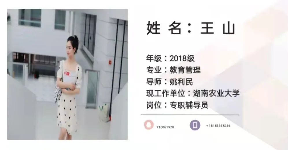 现于湖南农业大学任专职辅导员的2020届毕业生王山围绕高校辅导员的定义、职业认知与备考经验展开分享。高校辅导员是高等学校教师队伍和管理队伍的重要组成部分,是大学生思想政治教育的骨干力量,亦是大学生健康成长的指导者和引路人。她简单介绍了高校辅导员的工作职责、晋升渠道、薪资待遇等内容,鼓励大家成功必备决心、执行力、意志力以及正确的方法等秘诀!