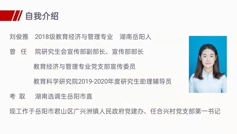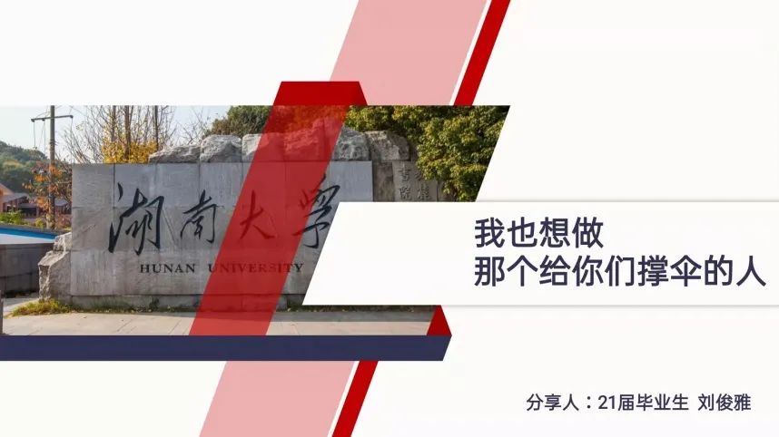现就职于岳阳市君山区广兴洲镇人民政府的2021届毕业生刘俊雅以“我也想做那个给你们撑伞的人”为主题展开分享。她回顾了研究生期间的学习经历、学生工作经历和求职经历,重点介绍了湖南省选调生的报考情况与备考经验,展示了基层工作内容与体会,建议大家视野要开阔、想法要落地、准备要周全、心态要良好,并祝“每一个披星戴月的夜晚都能听到答案”!