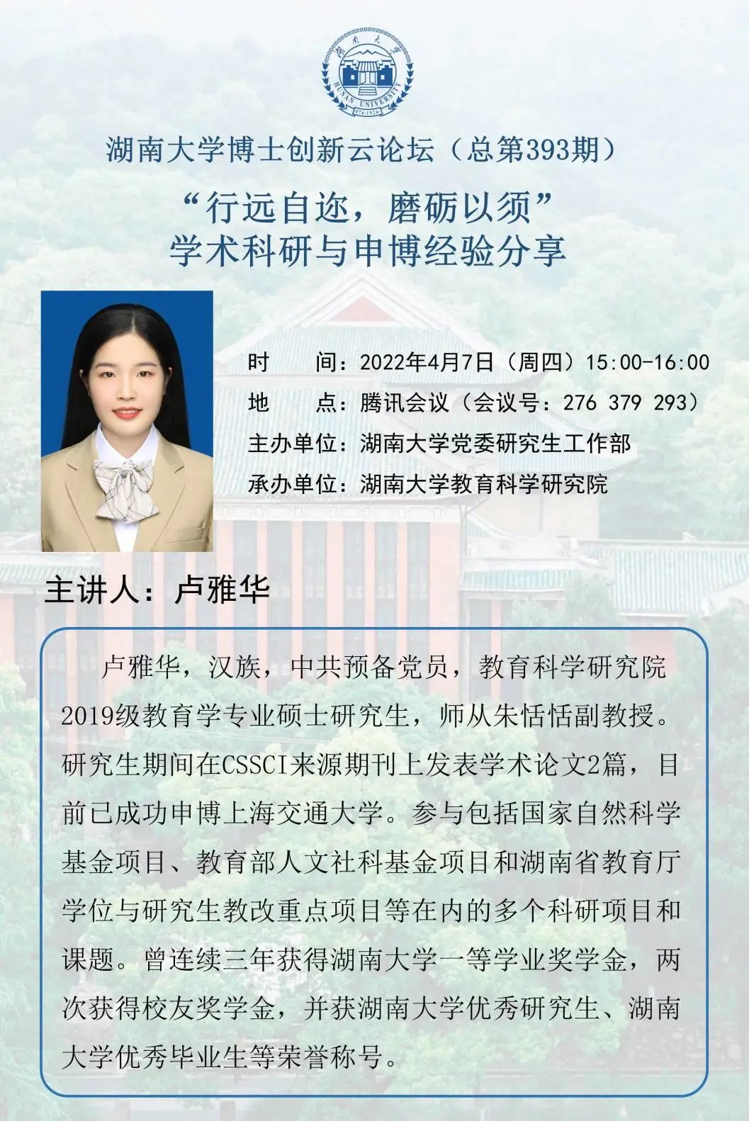 为提升我院学子的科研能力和学术素养,进一步明晰学术和职业规划,本期博士创新云论坛特邀请我院2019级教育学专业硕士、现已被拟录取为上海交通大学2022级博士研究生的卢雅华同学通过线上讲座向大家分享她的学术科研与申博经验。她将以学术科研成长历程为主线,结合个人在学术研究、日常生活和未来规划等多方面的思考,就文献阅读、科研感悟以及申博经验等内容进行分享。