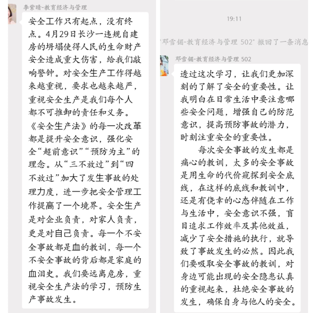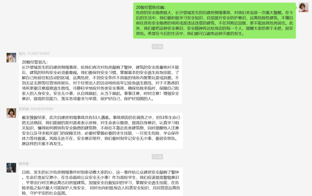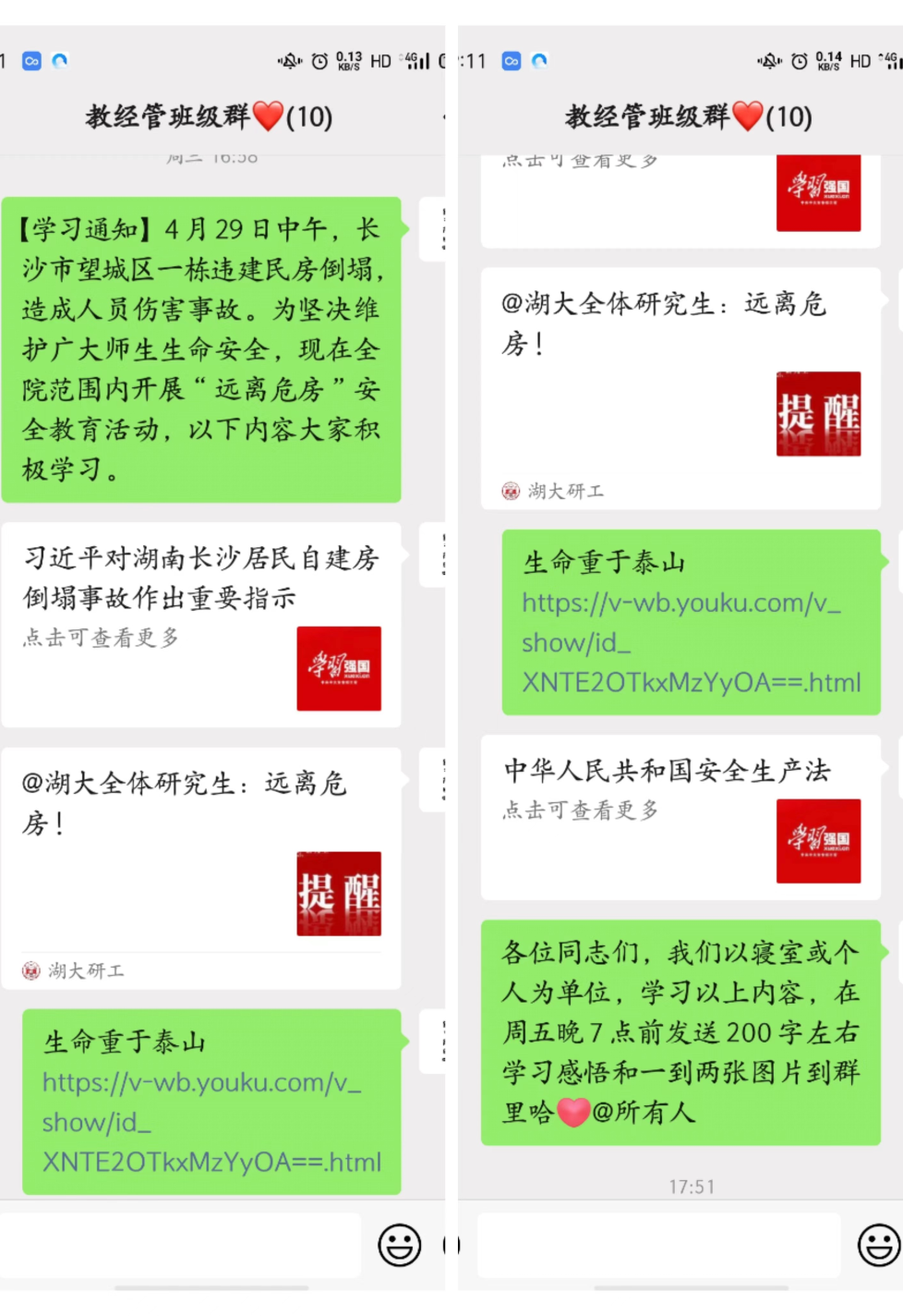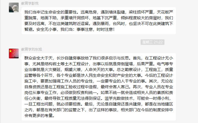 教科学子以班级为单位在线学习《习总书记对长沙居民自建房倒塌事故重要指示精神》《中华人民共和国安全生产法》以及湖大研工推出的《@湖大全体研究生:远离危房》等相关资料,并积极发表学习感想。