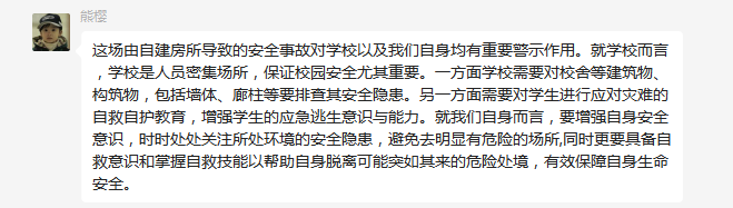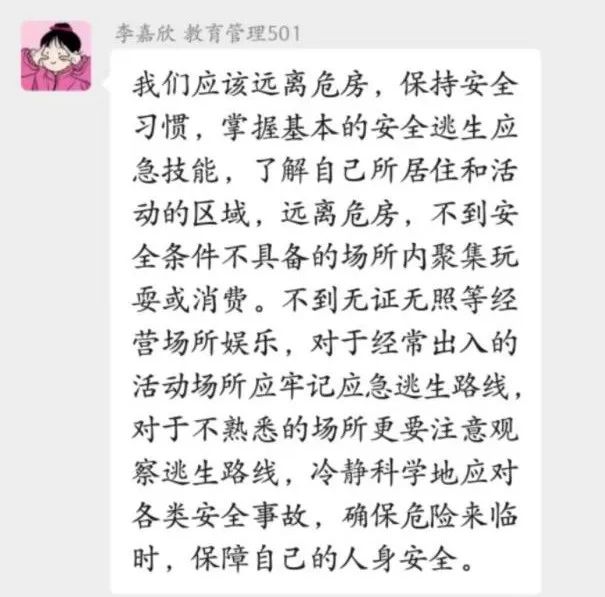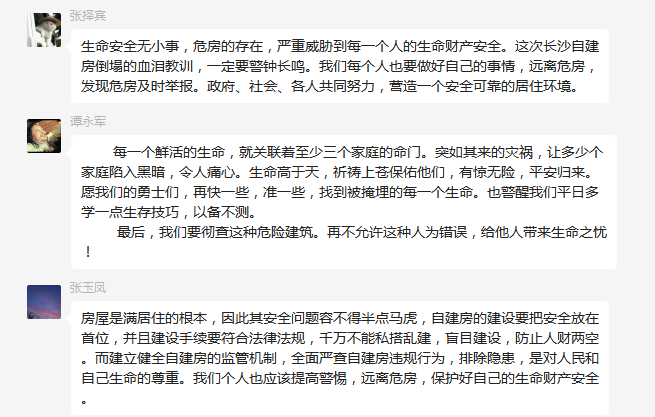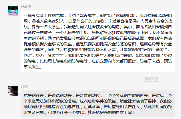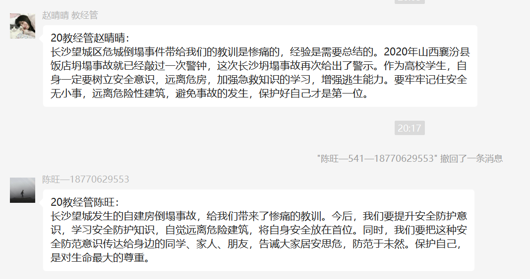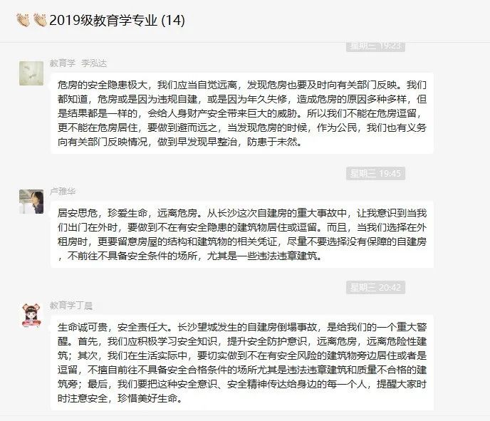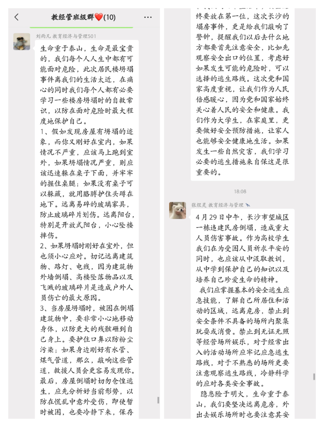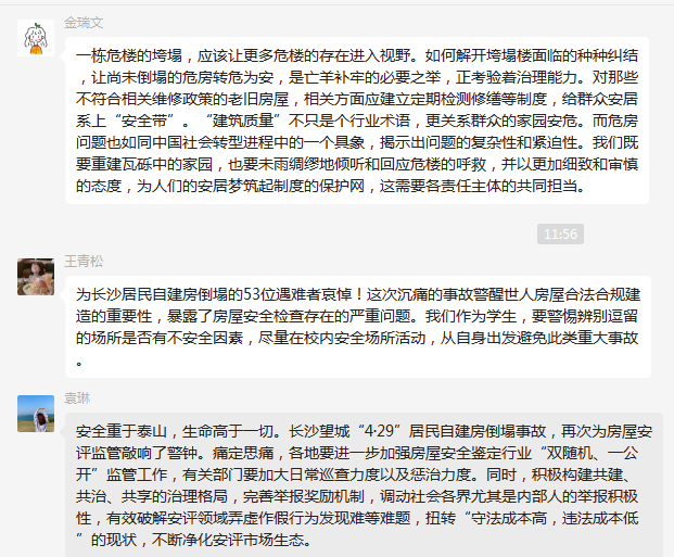教科学子以班级为单位在线学习《习总书记对长沙居民自建房倒塌事故重要指示精神》《中华人民共和国安全生产法》以及湖大研工推出的《@湖大全体研究生:远离危房》等相关资料,并积极发表学习感想。