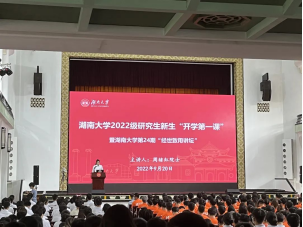 周绪红老师以“千年庭院为我打开一扇窗”为题,从“人文精神涵养心灵世界”“治学精神照亮学术道路”“处世智慧求解人生平衡方程”“教育思想提供办学治校方略”四大模块,分享了其在湖大的求学工作经历对个人发展、学术道路、教育理念的正向引导,激励全体研究生新生立足湖大,勤奋学习,开拓创新。