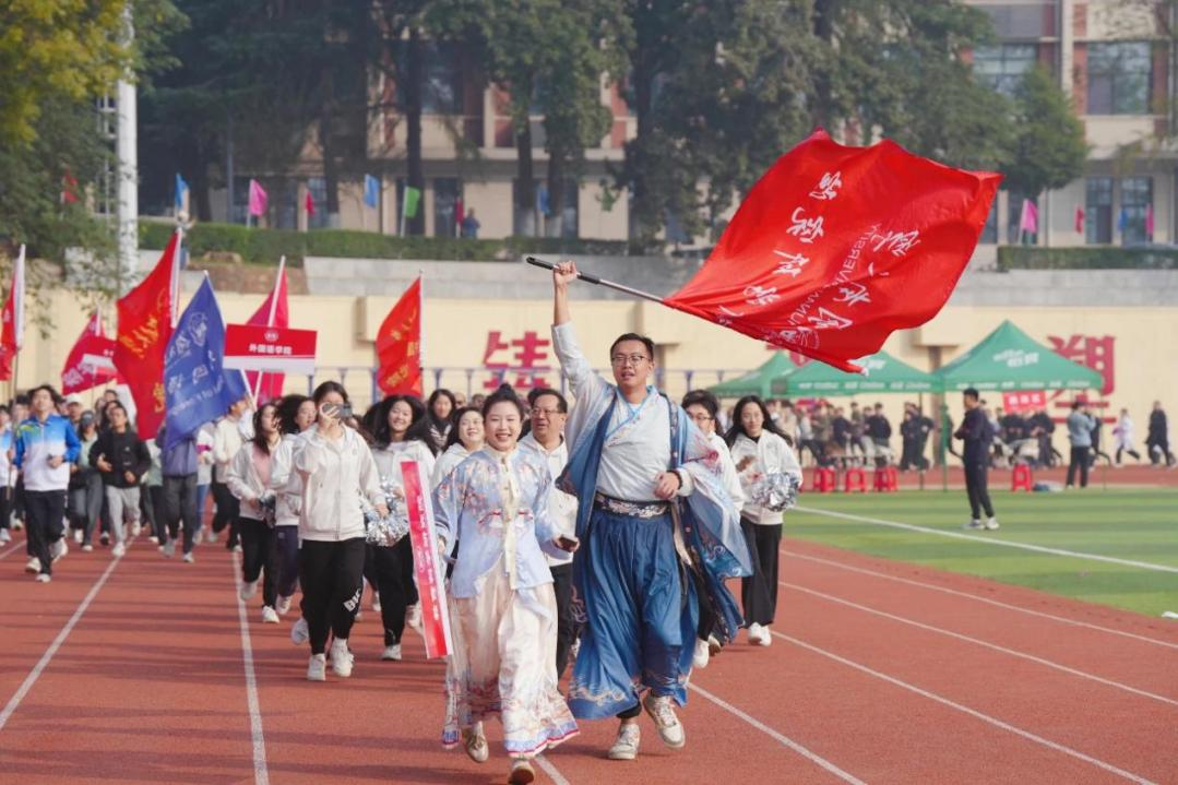 教科院方阵由2024级31名研究生和11位教师代表组成,他们或手持国旗,或手举花球,以嘹亮口号,激起我院运动健儿的斗志。