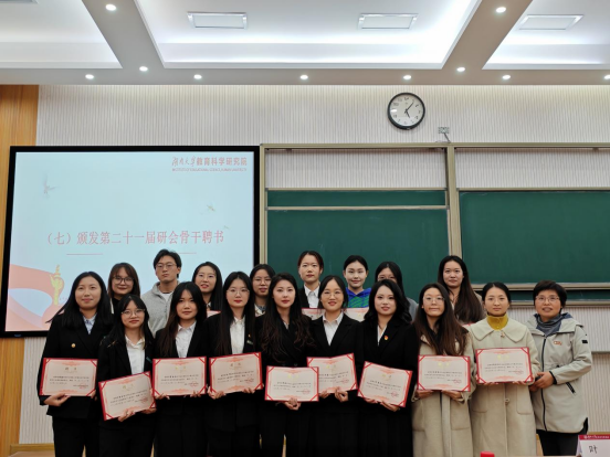 徐丹老师为第二十一届研究生会骨干颁发聘书并合影留念。