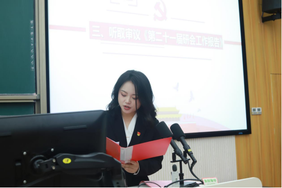 第二十一届研究生会主席严晨卉对我院研究生会工作进行总结报告。她历数了第二十一届研究生会在过去一年中开展的工作以及取得的成绩,期望第二十二届研会成员能够不忘初心、牢记使命,把工作职责融入每一个细节当中,甘当学院的勤务兵,齐心协力共创太阳成tyc33455cc的新篇章。